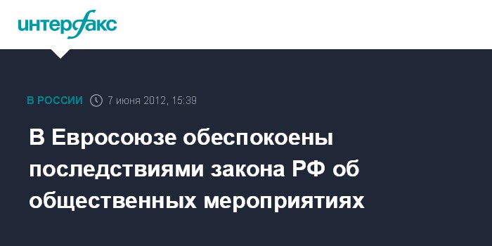 Брюссель. 7 июня. INTERFAX.RU - Евросоюз принял к сведению одобрение двумя палатами Федерального Собрания России проекта закона, предусматривающего значительное увеличение штрафов и различные меры наказания за нарушения во время общественных мероприятий, в том числе демонстраций, заявила официальный представитель главы европейской дипломатии Майя Коцьянчич.