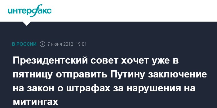 Москва. 7 июня. ИНТЕРФАКС - Президентский совет по правам человека в пятницу рассчитывает направить президенту РФ Владимиру Путину экспертное заключение на закон об ужесточении наказания за нарушения на митингах.