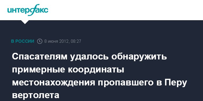 Сеул. 8 июня. INTERFAX.RU - Военно-воздушные силы Перу обнаружили по сигналам спутника примерное местоположение пропавшего вертолета, на борту которого находилось 14 иностранцев, в том числе восемь граждан Южной Кореи, сообщают южнокорейские СМИ в пятницу.