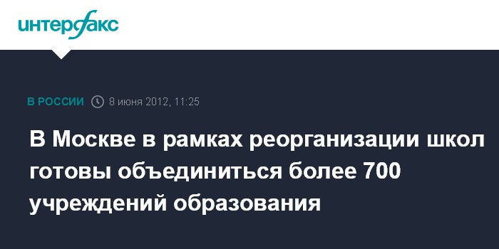 По ее словам, с инициативой об объединении, таким образом, выступило 710 образовательных учреждений столицы. "Выпущен 131 нормативно-правовой акт о реорганизации 388 образовательных учреждений", - сообщила начальник управления.