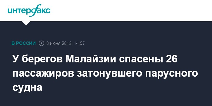 Сингапур. 8 июня. INTERFAX.RU - Экипаж корабля ВМС Малайзии спас 26 пассажиров и членов команды парусной яхты, затонувшей около малазийской части острова Борнео, сообщили в пятницу местные власти.