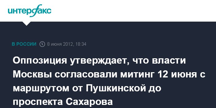 Оппозиция утверждает, что власти Москвы согласовали митинг 12 июня с маршрутом от Пушкинской до проспекта Сахарова