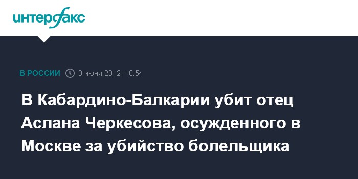 Нальчик. 8 июня. INTERFAX.RU - Отец Аслана Черкесова, осужденного в Москве за убийство футбольного болельщика Егора Свиридова, Магомед Черкесов погиб в результате разбойного нападения в селе Куба-Таба Кабардино-Балкарии, сообщил агентству "Интерфакс-Юг" представитель Баксанского межрайонного следственного отдела СКР по КБР.