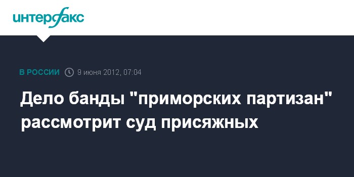 Владивосток. 9 июня. ИНТЕРФАКС-ДАЛЬНИЙ ВОСТОК – Громкое уголовное дело банды так называемых "приморских партизан" будет рассматривать коллегия присяжных заседателей, сообщила в субботу агентству "Интерфакс-Дальний Восток" помощник пресс-секретаря Приморского краевого суда Екатерина Медведева.