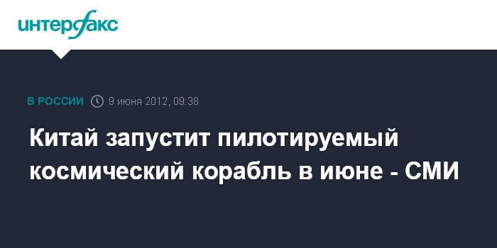 Пекин. 9 июня. INTERFAX.RU - Запуск в космос пилотируемого китайского корабля "Шэньчжоу-9" решено провести в июне 2012 года, сообщают в субботу официальные пекинские СМИ. В сообщениях приводятся слова одного из чиновников, отвечающих за китайскую космическую программу, заявившего, что, вероятно, запуск "Шэньчжоу-9" состоится "где-то в середине июня".
