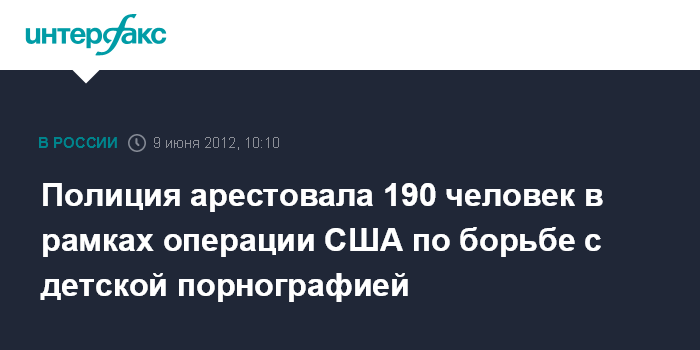 Вашингтон. 9 июня. INTERFAX.RU - Не менее 190 человек были арестованы полицией в рамках организованной по иницитативе США международной операции "Орион" по борьбе с детской порнографией, заявили в субботу в американской Иммиграционной и таможенной полиции (ICE). "Пусть эта операция будет предупреждением для всех, кто думает, что может использовать Интернет для растления несовершеннолетних: мы за вами наблюдаем, найдем вас и накажем по закону", - заявил глава ICE Джон Мортон.