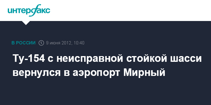 Якутск. 9 июня. INTERFAX. RU - Пассажирский Ту-154, выполнявший рейс из города Мирный в Домодедово, вынужден был вернуться в аэропорт вылета из-за проблем с шасси, сообщил "Интерфаксу" источник в авиадиспетчерских службах Якутии.