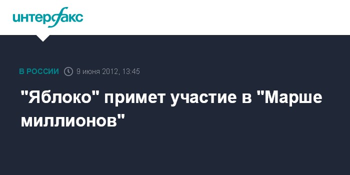 Москва. 9 июня. INTERFAX.RU - Партия "Яблоко" присоединится к оппозиционному "Маршу миллионов" 12 июня, чтобы выступить против нового закона о митингах. "Партия "Яблоко" примет участие в "Марше миллионов" 12 июня, где выразит протест против подписания президентом Владимиром Путиным закона, фактически запрещающего уличные акции", - сообщил пресс-секретарь партии Игорь Яковлев "Интерфаксу" в субботу.