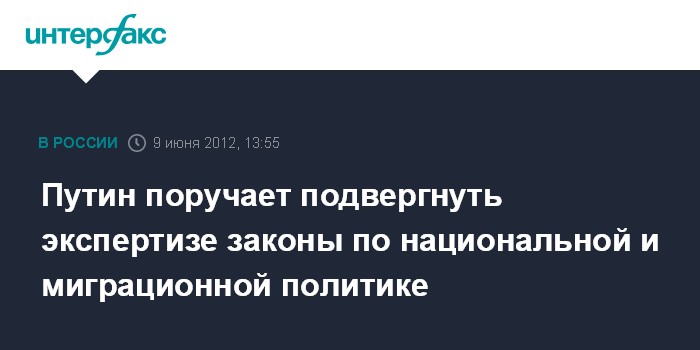 Москва. 9 июня. INTERFAX.RU - Президент РФ Владимир Путин поручил Совету по межнациональным отношениям провести экспертизу законов, затрагивающих национальную и миграционную политику, в том числе законопроектов, направленных на усиление ответственности за нарушения в сфере миграции.