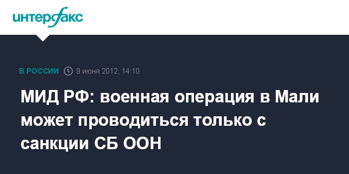 Москва. 9 июня. INTERFAX.RU - Россия считает, что военная операция в Мали по поддержанию мира в этой стране силами Экономического сообщества западноафриканских государств (ЭКОВАС) или другой организации должна быть санкционирована СБ ООН, заявил официальный представитель МИД РФ Александр Лукашевич.