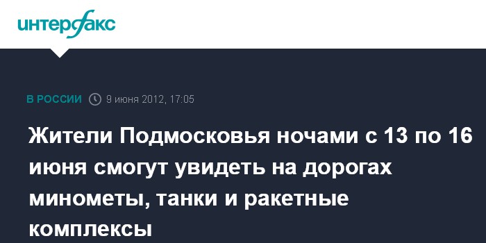 Москва. 9 июня. INTERFAX.RU - Колонну военной техники километровой длины можно будет видеть на подмосковных дорогах в районах Алабино и Жуковского 13-16 июня по ночам.