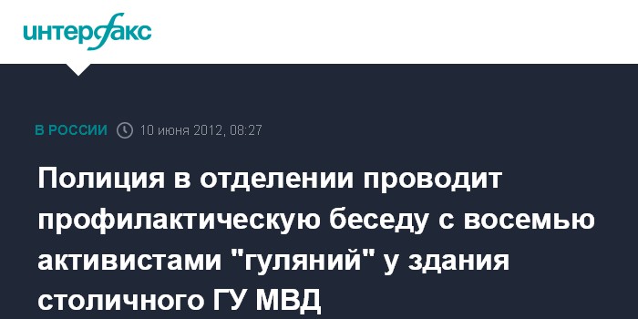 Москва. 10 июня. ИНТЕРФАКС – Для установления личностей и проведения профилактической беседы в отдел полиции с улицы Петровка были доставлены восемь человек, сообщили "Интерфаксу" в воскресенье в пресс-службе ГУ МВД России по Москве.