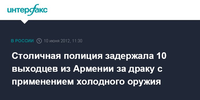 По его данным, драка произошла в 1:30 во дворе дома N33/19 по улице Генерала Белова из-за бытового конфликта на почве распития спиртных напитков. Во время драки выходцы из Армении применили ножи. В результате двое молодых москвичей были госпитализированы в институт Склифосовского с множественными ножевыми ранениями.