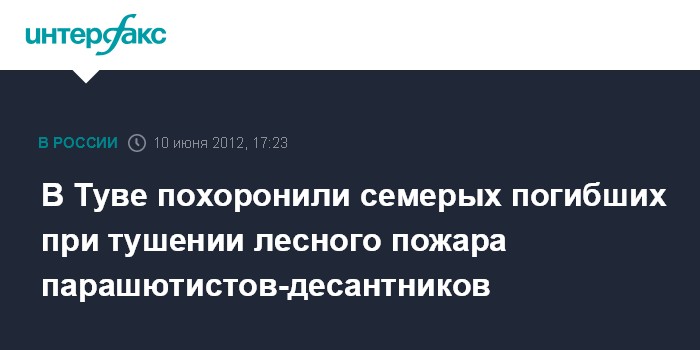 Кызыл. 10 июня. INTERFAX.RU - Похороны семерых из восьми парашютистов-десантников, погибших 6 июня при тушении лесного пожара, состоялись в воскресенье в Республике Тува, сообщает пресс-служба республиканского правительства.