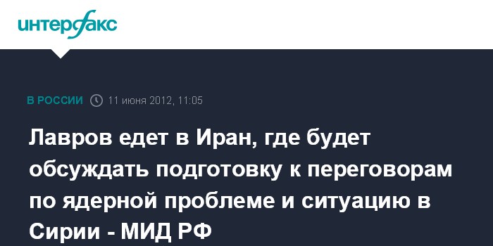 Москва. 11 июня. INTERFAX.RU - Ситуация в Сирии и подготовка переговоров "шестерки" с Тегераном по иранской ядерной программе (ИЯП) будут обсуждаться во время визита главы МИД РФ Сергея Лаврова в Иран 13 июня, сообщили в МИД РФ. "13 июня состоится визит министра иностранных дел России в Иран. В центре внимания в ходе бесед с руководством этой страны будет находиться общая ситуация на пространстве Ближнего и Среднего Востока и Северной Африки, в том числе с акцентом на нынешние трансформационные процессы в арабском мире и положение дел в Сирии", - заявили журналистам в российском внешнеполитическом ведомстве.