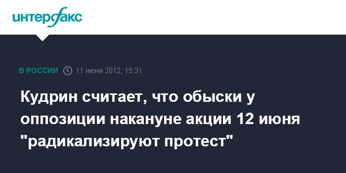 Москва. 11 июня. INTERFAX.RU - Обыски оппозиционеров накануне 12 июня наряду с новым законом радикализируют протест и демонстрируют усиление радикалов во власти, написал в своем микроблоге "Twitter" экс-министр финансов России Алексей Кудрин.
