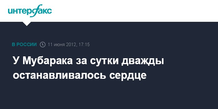 Каир. 11 июня. INTERFAX.RU - Бывшему президенту Египта Хосни Мубараку, который сейчас находится в медицинской части каирской тюрьмы "Тора", в течение понедельника дважды пришлось делать дефибрилляцию из-за остановки сердца, сообщают медицинские источники в Каире. Ранее представители министерства внутренних дел Египта сообщили, что состояние здоровья бывшего египетского президента Хосни Мубарака остается критическим, но оно стабильно.