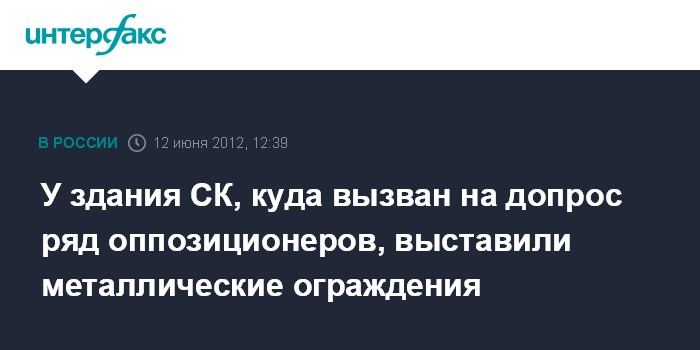 Москва. 12 июня. INTERFAX.RU - Металлические ограждения появились у здания Следственного комитета России, где во вторник допрашивают оппозиционеров в рамках дела о беспорядках на Болотной площади 6 мая.
