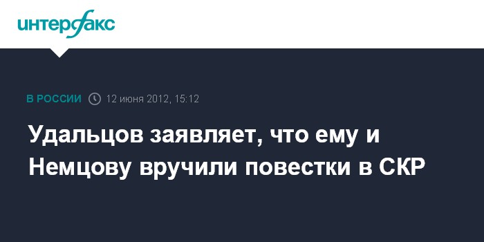 Москва. 12 июня. INTERFAX.RU - Оппозиционеры Сергей Удальцов и Борис Немцов приглашены на допрос в Следственный комитет РФ вечером во вторник.