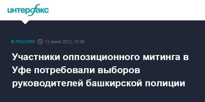 Уфа. 12 июня. INTERFAX.RU - Введение выборности глав подразделений башкирской полиции потребовали участники санкционированного митинга в Уфе, заявленного активистом общественного движения "Комсомол Башкирии" Вилем Халиловым в знак солидарности с акцией оппозиции "Марш миллионов" в Москве.