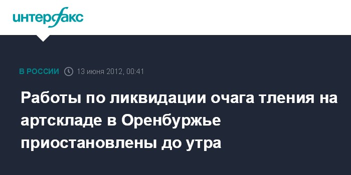 Самара. 12 июня. ИНТЕРФАКС-ПОВОЛЖЬЕ - Все работы по проливке территории артсклада в Оренбургской области и ликвидации очага тления остановлены до утра среды, сообщила агентству "Интерфакс" и.о. руководителя пресс-службы ГУ МЧС по Оренбургской области Татьяна Самойлова.