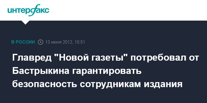 Москва. 13 июня. INTERFAX.RU - Главный редактор "Новой газеты" Дмитрий Муратов потребовал от главы СКР Александра Бастрыкина гарантий безопасности журналистов издания в связи с конфликтом Бастрыкина с заместителем Муратова Сергеем Соколовым.