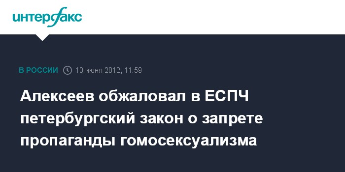 Москва. 13 июня. INTERFAX.RU - Основатель движения Московского гей-парада Николай Алексеев обратился в Европейский суд по правам человека (ЕСПЧ) с жалобой на закон Санкт-Петербурга об административной ответственности за пропаганду гомосексуализма среди несовершеннолетних.