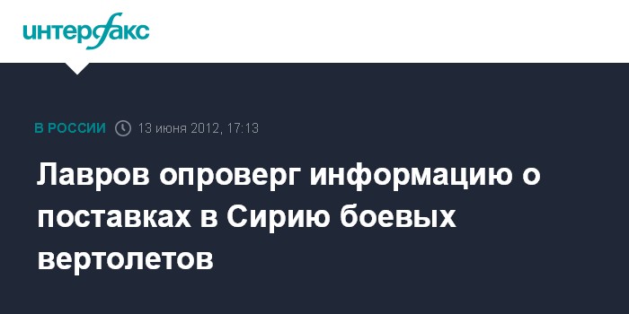 Тегеран. 13 июня. INTERFAX.RU - Глава МИД РФ Сергей Лавров опровергает информацию госсекретаря США Хилари Клинтон о том, что Москва поставляет сирийским властям боевые вертолеты.