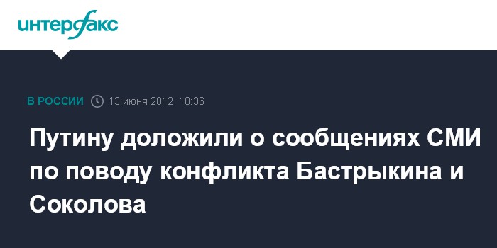 Москва. 13 июня. INTERFAX.RU - Президенту РФ Владимиру Путину доложили о публикациях в СМИ по поводу конфликта между главой СКР Александром Бастрыкиным и шеф-редактором "Новой газеты" Сергеем Соколовым, сообщил пресс-секретарь главы государства Дмитрий Песков.