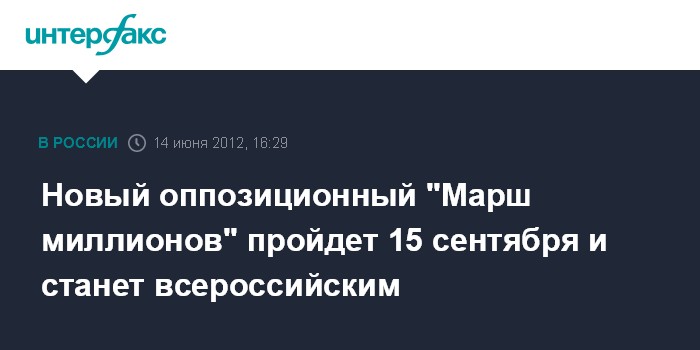 Москва. 14 июня. INTERFAX.RU - Оппозиция приняла решение провести следующую массовую акцию "Марш миллионов" в середине сентября по всей России, сообщил лидер "Левого фронта" Сергей Удальцов.