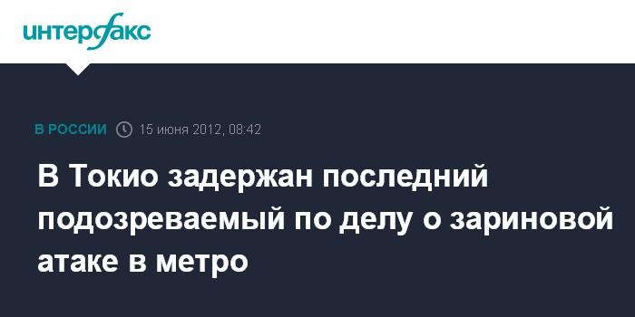 Лондон. 15 июня. INTERFAX.RU - Японские полицейские задержали последнего из подозреваемых по делу о распылении газа в токийском метро в 1995 году, в результате которого погибли 13 человек, сообщает BBC в пятницу.