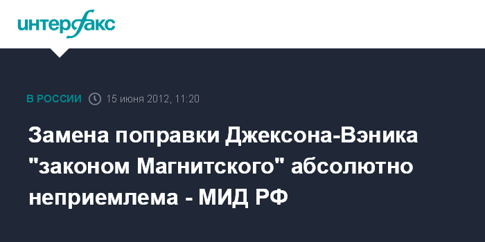 Москва. 15 июня. INTERFAX.RU - МИД РФ называет неприемлемой возможную замену в США поправки Джексона-Вэника на так называемый закон Магнитского.
