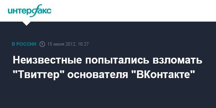 Москва. 15 июня. INTERFAX.RU - Неудачная попытка взлома аккаунта в Twitter, принадлежащего основателю социальной сети "ВКонтакте" Павлу Дурову, была совершена в пятницу.