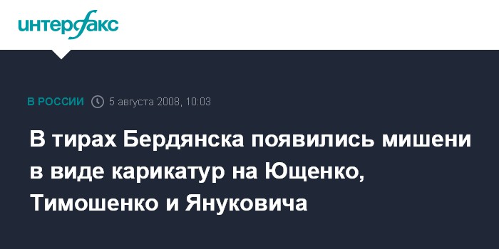 Москва. 5 августа. INTERFAX.RU - В Бердянске Запорожской области открыты тиры с мишенями в виде карикатур лидеров основных политических сил и руководства государства: президента Виктора Ющенко, премьер-министра Юлии Тимошенко, лидера оппозиции Виктора Януковича, передает корреспондент агентства "Интерфакс-Украина".