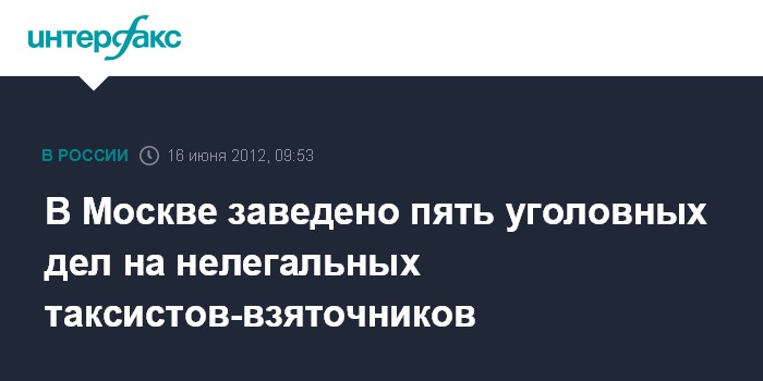 Москва. 16 июня. INTERFAX.RU - С марта этого года, когда в Москве начался "отлов" нелегальных таксистов, их поймано свыше 400, сообщили "Интерфаксу" в пресс-службе департамента транспорта и развития дорожно-транспортной инфраструктуры столицы. "За время проведения мероприятий с марта по июнь составлен 421 протокол об административном правонарушении на нелегальных таксистов, вынесено решение по 45 административным материалам. Эвакуировано 176 автомобилей. Также возбуждено 5 уголовных дел в отношении водителей нелегального такси по статье 291 УК РФ "Дача взятки", - рассказал собеседник агентства.