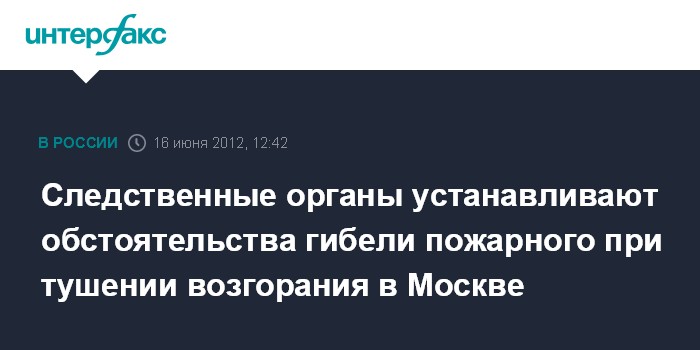 Москва. 16 июня. INTERFAX.RU - Доследственная проверка проводится по факту гибели сотрудника МЧС в ходе тушения пожара на северо-востоке Москвы, сообщает в субботу сайт СК РФ.