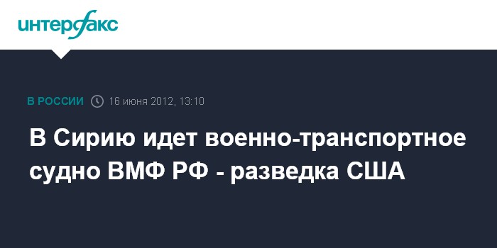 Вашингтон. 16 июня. INTERFAX.RU - США внимательно следят за передвижением российского военно-транспортного судна, направляющегося в Сирию с грузом оружия, снаряжения и отрядом морской пехоты, сообщили американские телеканалы, ссылаясь на разведисточники. "Американская разведка полагает, что Россия направила корабль для защиты своего пункта материально-технического обеспечения ВМФ РФ в сирийском порту Тартусе", - сообщили в субботу телеканалу SNN представители Пентагона.