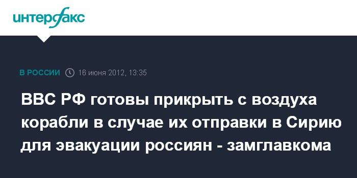 Поселок Чкаловский (Московская область). 16 июня. INTERFAX.RU - Российские Военно-воздушные силы готовы обеспечить прикрытие с воздуха кораблей в случае их отправки в Сирию, если такая задача будет поставлена президентом страны, заявил замглавкома ВВС генерал-майор Владимир Градусов журналистам в субботу. "Авиация ВВС будет готова выполнить любую задачу, которую нам поставит Верховный главнокомандующий", - сказал В.Градусов, отвечая на вопрос "Интерфакса-АВН", готова ли авиация ВВС прикрыть с воздуха российские боевые корабли в случае их отправки в Сирию для защиты и эвакуации находящихся там российских граждан.