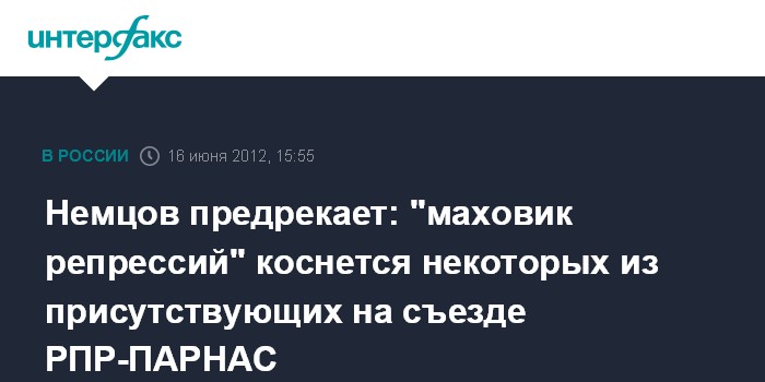 Москва. 16 июня. INTERFAX.RU - Борис Немцов предостерег делегатов объединенного съезда РПР-ПАРНАС от веры в то, что репрессии в стране не будут нарастать. "Маховик репрессий будет раскручиваться и коснется некоторых из здесь присутствующих", - сказал Б.Немцов, выступая на объединительном съезде РПР-ПАРНАС в субботу.