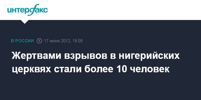 Лагос. 17 июня. INTERFAX.RU - По меньшей мере, 12 человек погибли, более 80 пострадали в результате взрывов, прогремевших в воскресенье в пяти церквях в штате Кадуна на севере Нигерии, сообщили сотрудники Красного Креста. На месте событий работают спасатели. По словам очевидцев, окончательное количество погибших может оказаться намного больше названной цифры.