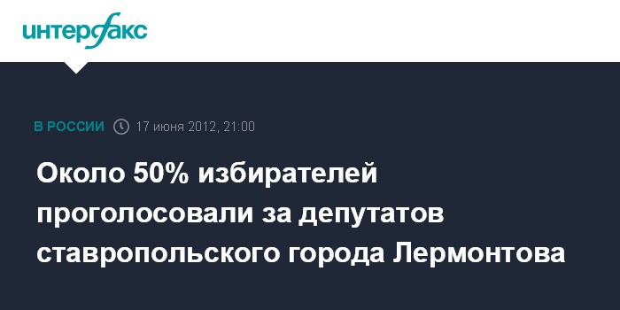 Пятигорск. 17 июня. ИНТЕРФАКС-ЮГ - Явка на выборах депутатов в горсовет города Лермонтова (Ставропольский край) пятого созыва составила около 50%, сообщили агентству "Интерфакс-Юг" в территориальной избирательной комиссии.