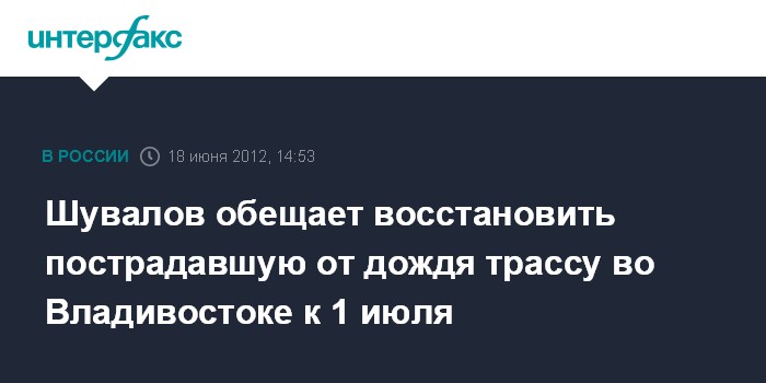 Горки. 18 июня. INTERFAX.RU - Вице-премьер Игорь Шувалов заявил, что размытая ливнем трасса от аэропорта Владивостока к острову Русский может быть отремонтирована к 1 июля.