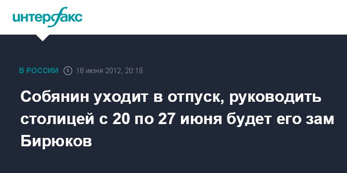 Москва. 18 июня. INTERFAX.RU - Обязанности мэра Москвы в течение недели будет исполнять Петр Бирюков в связи с отпуском Сергея Собянина, сообщила журналистам пресс-секретарь столичного градоначальника Гульнара Пенькова.