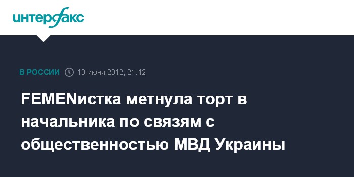 Киев. 18 июня. INTERFAX.RU - Представительница движения FEMEN бросила торт в начальника управления по связям с общественностью МВД Украины Владимира Полищука.