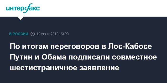 Лос-Кабос (Мексика). 18 июня. INTERFAX.RU - Президенты России и США Владимир Путин и Барак Обама приняли совместное заявление по итогам переговоров "на полях" саммита "двадцатки".