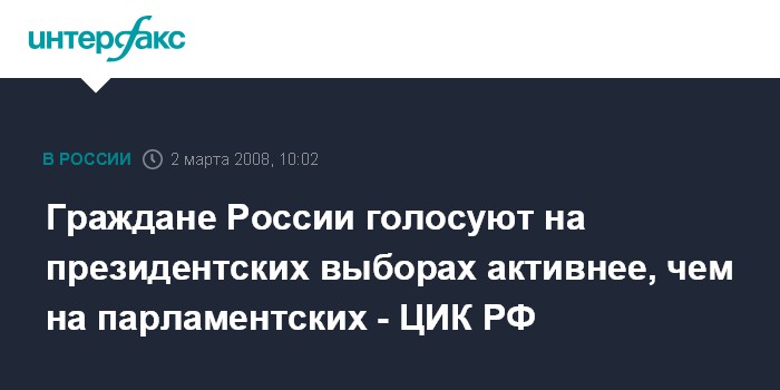 Москва. 2 марта. ИНТЕРФАКС - Российские избиратели голосуют на президентских выборах более активно, чем на состоявшихся 2 декабря выборах депутатов пятой Государственной Думы, заявил секретарь ЦИК РФ Николай Конкин.