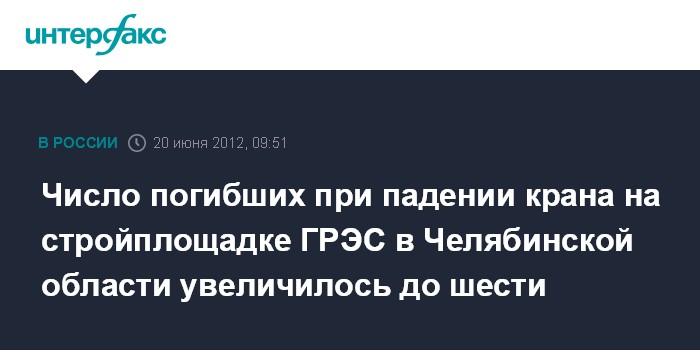 Челябинск. 20 июня. INTERFAX.RU - В районной больнице Троицка скончался шестой из десяти пострадавших в результате падения башенного крана на стройплощадке Троицкой ГРЭС (входит в подконтрольную ОАО "Газпром" ОГК-2), сообщает пресс-служба МЧС по Челябинской области.