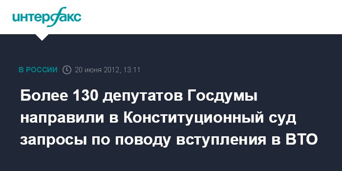 Москва. 20 июня. INTERFAX.RU - Более 140 депутатов Госдумы от КПРФ и "Справедливой России" подали в Конституционный суд запрос "о проверке конституционности не вступившего в силу протокола о вступлении Российской Федерации в ВТО".