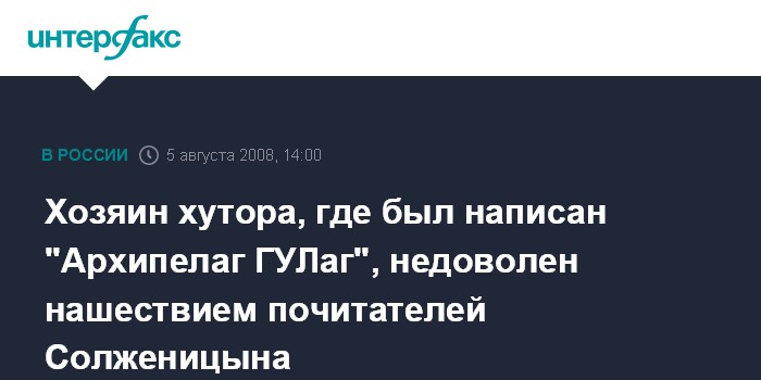 Москва. 5 августа. INTERFAX.RU - Хозяин хутора, где Александр Солженицын написал свой знаменитый роман "Архипелаг ГУЛаг", недоволен нашествием туристов и почитателей лауреата Нобелевской премии.