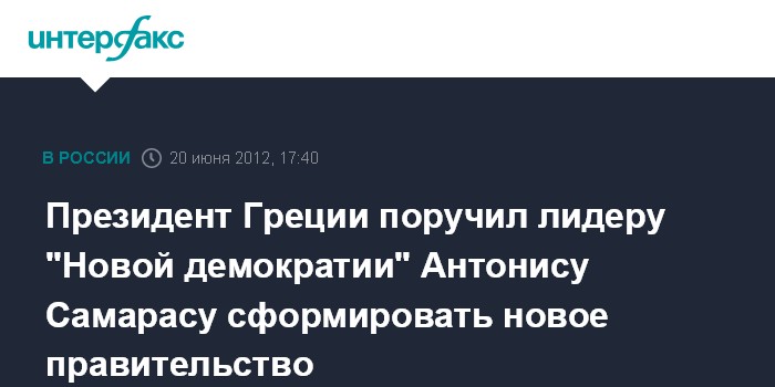 Афины. 20 июня. INTERFAX.RU - Лидер греческой партии "Новая демократия" Антонис Самарас в среду получил от президента страны Каролоса Папульяса мандат на формирование нового правительства.